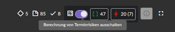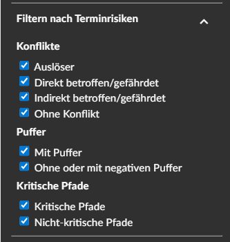 Im Filterpanel ist ein neuer Bereich „Filtern nach Terminrisiken“ entstanden. Hier findest du ab sofort die Filter für Konflikte, Puffer und Kritische Pfade.