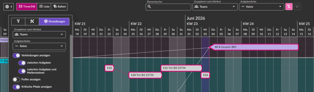 In den Einstellungen gibt es die Möglichkeit die kritischen Pfade anzeigen zu lassen. Ein kritischer Pfad ist in TimeLEAN eine Prozesskette mit einem Gesamtpuffer von 0 oder weniger Tagen zu ihrem Meilenstein. Dieser wird dann pink umrandet.