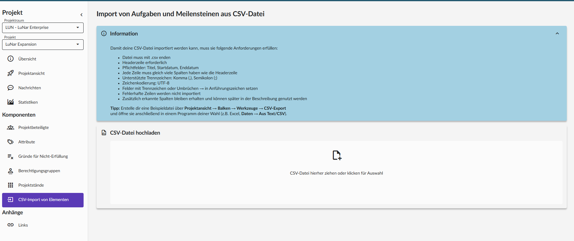 Der CSV-Import ermöglicht es, Aufgaben und Meilensteine in einen neuen oder bereits bestehenden Projektstand zu importieren.